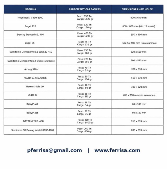 Tenemos un parque de maquinaria moderno para una amplia gama de piezas. Maquinas de inyeccion electricas e hidraulicas desde 10 gr. hasta 1.800 gr.